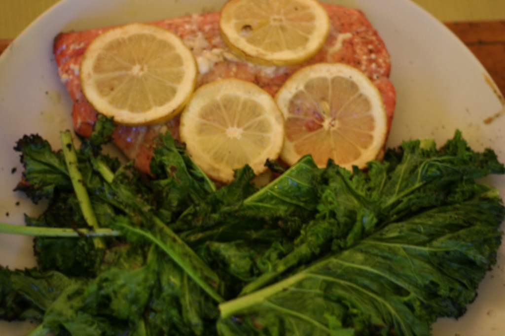 Wash your salmon, pucker up, kiss your fish and lay down with a tender pat. Do zees in a dish just shallow/long enough that you can drizzle/squeeze and generally play around in. Drizzle with oil (1/2 amount listed above); juice of one lemon, minced garlic, salt and pepper to taste. With clean mitts, flip, flop and swaddle Mr. Salmon in this business. Set aside to hand over to your grill king/queen. Wash and chop the healthiest/yummiest green ever (kale). Not to big, not too small – loosey goosey, just so’s you can flash it in the bbq wok and use a knife and fork to cut when eating. Having just been drizzled and tossed with 1/4 cup of your oil, juice of 1/2 a lemon, salt (sea) and pepp (coarse, grind) to taste. Set aside to place in the wok when the time comes. Someone should have gone a heated/cleaned the grill about 10 min. ago, so it’s all ready for action.