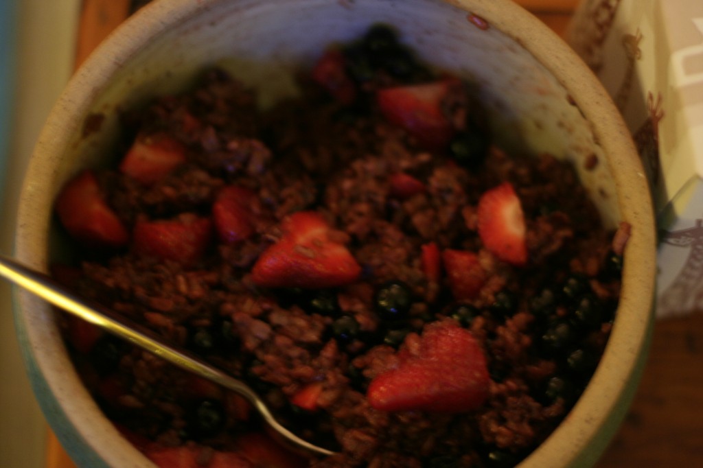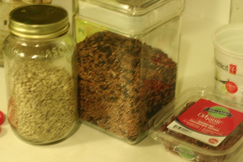 - 1/2 cup ea. of strawberries, blueberries, raw sunflower seeds, slivered almonds, dried cranberries, 1/4 cup of flax seeds
